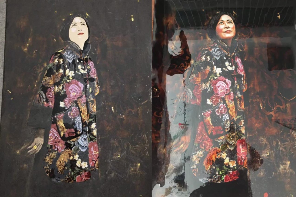 越南人氣漆畫家陳俊龍_繪製正觀藝術林文娟總監肖像畫