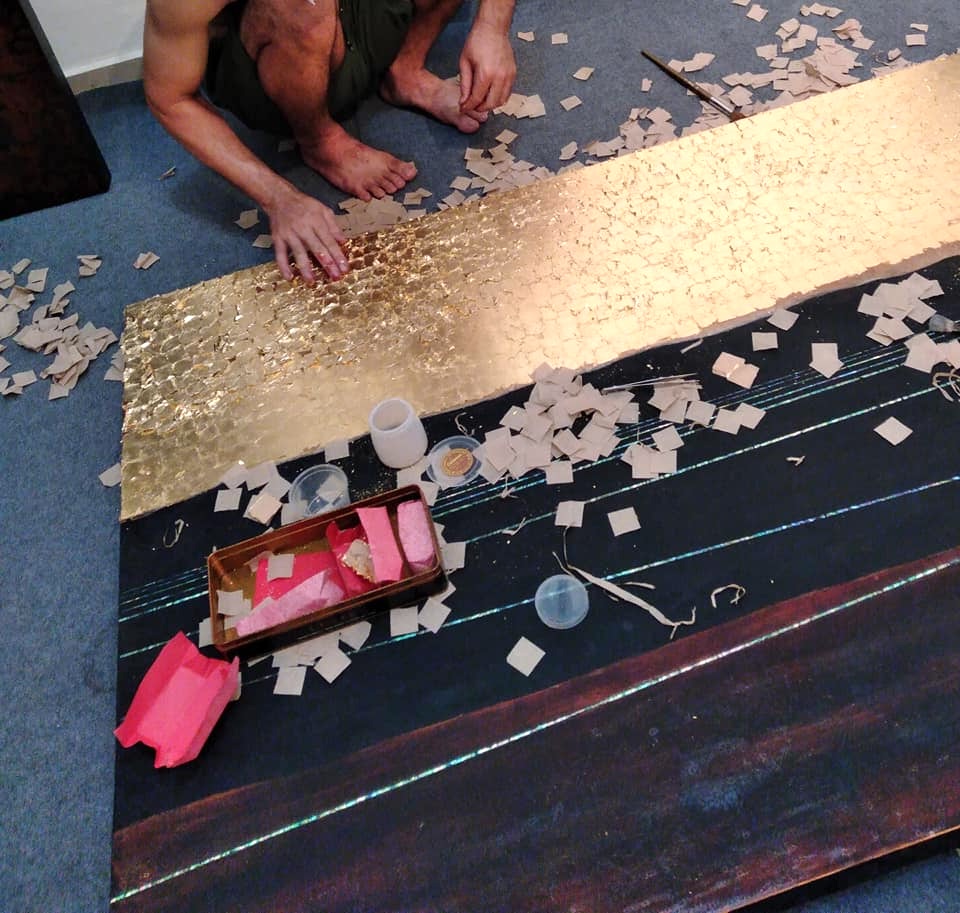 漆畫的創作是一場與未知的博弈。一件作品往往需經過 10 層甚至更多顏料的相互疊加,這完全取決於藝術家對主題的構思。然而,漆畫最特別之處在於「盲測」般的創作過程,打磨不只是工序,更是繪畫的一部分。